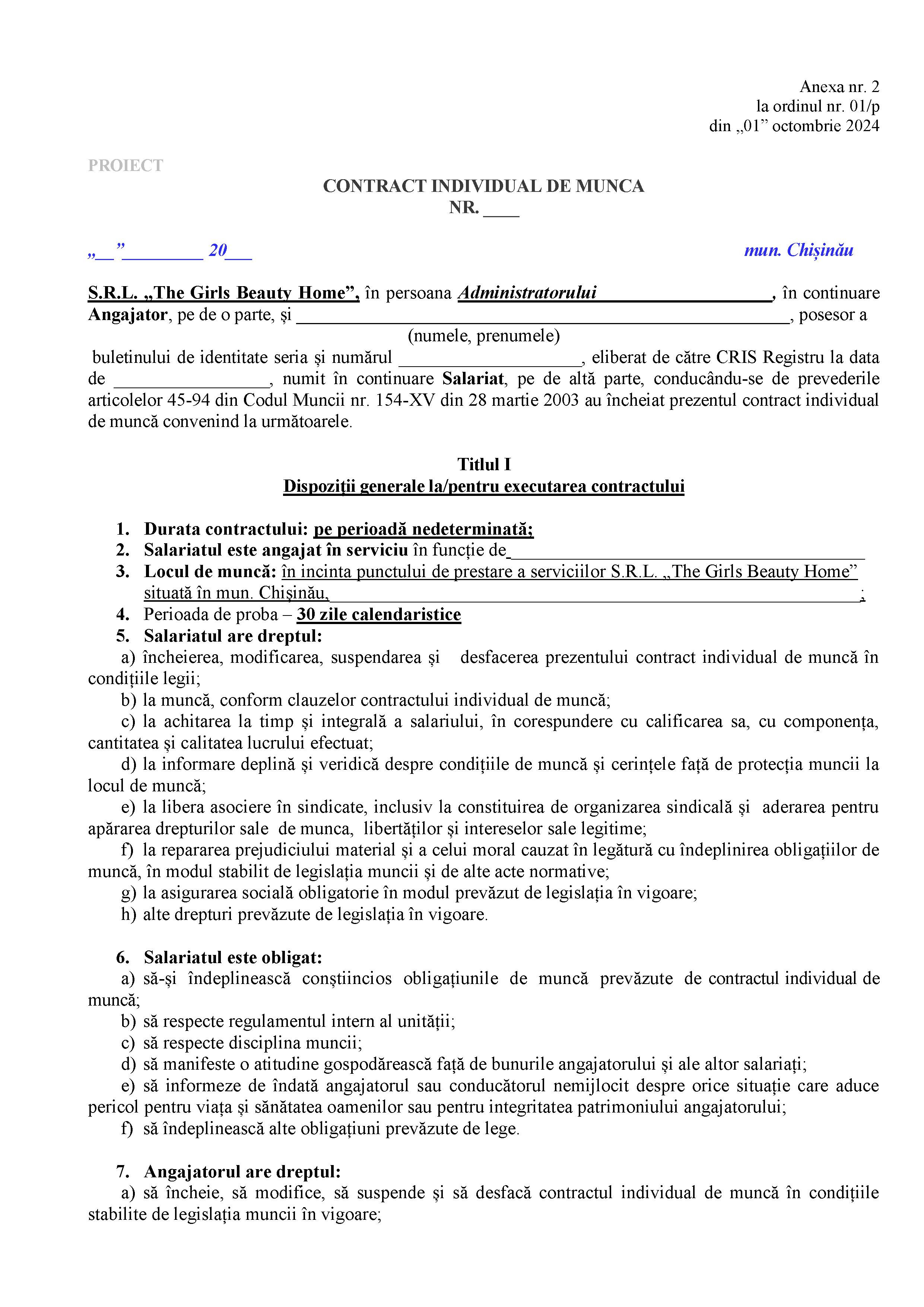 Anterior angajării sau transferării într-o nouă funcție, SRL „The Girls Beauty Home” (în continuare – Angajator), va informa persoana care urmează a fi angajată sau transferată despre condițiile de activitate în funcția propusă, oferindu-i informaţia prevăzută la art. 49 alin. (1) din Codul Muncii, informaţia privind perioadele de preaviz ce urmează a fi respectate de angajator şi salariat în cazul încetării activităţii, Regulamentul intern al Angajatorului, precum şi despre prevederile Contractului individual de muncă. Proiectul Contractului poate fi citit mai jos.